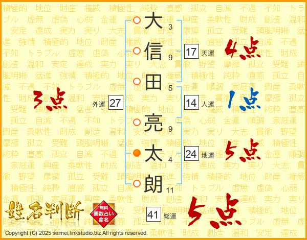 大(3画)信(9画)田(5画) 亮(9画)太(4画)朗(11画)