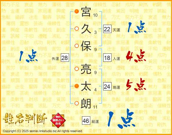 宮(10画)久(3画)保(9画) 亮(9画)太(4画)朗(11画)