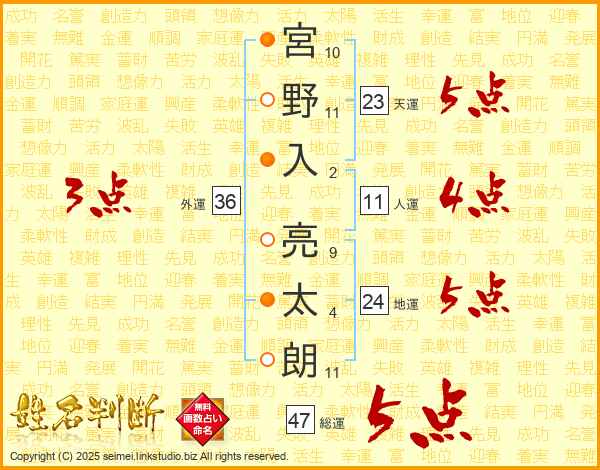 宮(10画)野(11画)入(2画) 亮(9画)太(4画)朗(11画)