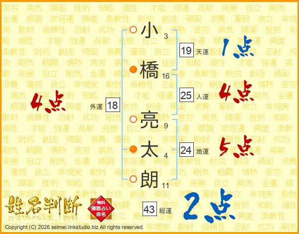 小(3画)橋(16画) 亮(9画)太(4画)朗(11画)