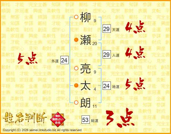 柳(9画)瀬(20画) 亮(9画)太(4画)朗(11画)