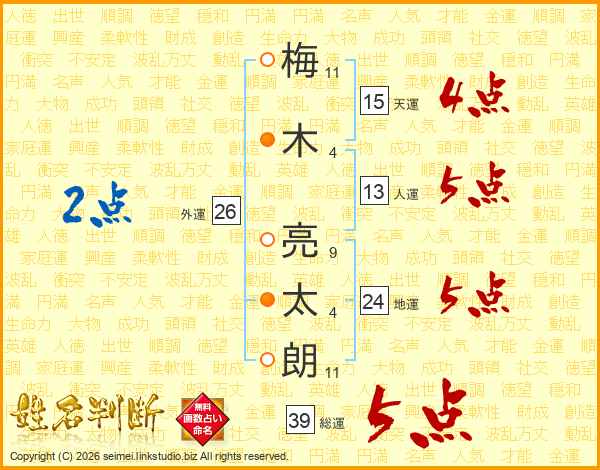 梅(11画)木(4画) 亮(9画)太(4画)朗(11画)