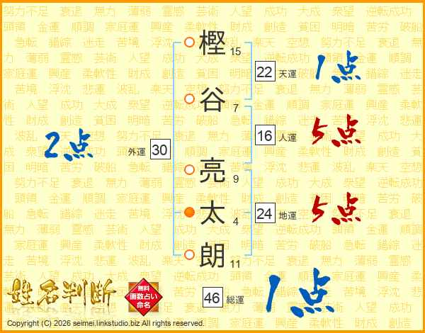 樫(15画)谷(7画) 亮(9画)太(4画)朗(11画)