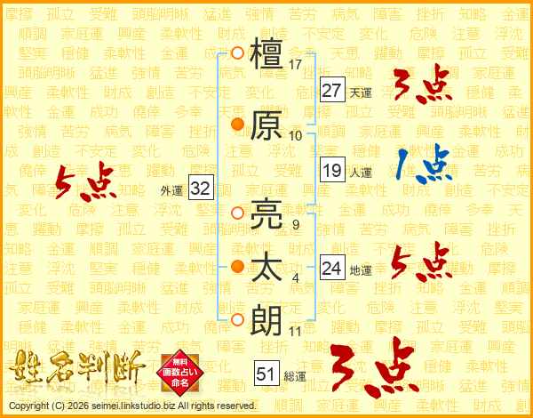檀(17画)原(10画) 亮(9画)太(4画)朗(11画)