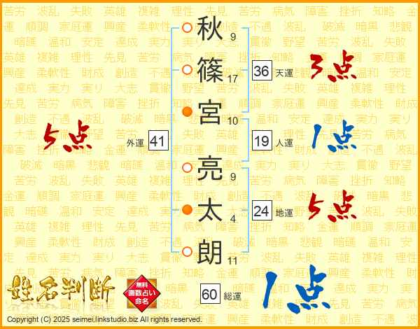 秋(9画)篠(17画)宮(10画) 亮(9画)太(4画)朗(11画)