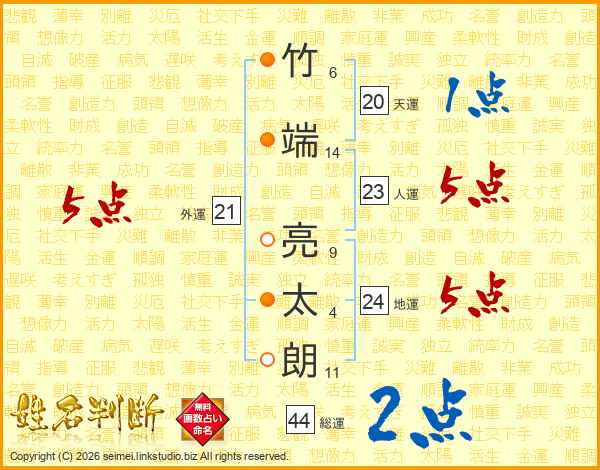 竹(6画)端(14画) 亮(9画)太(4画)朗(11画)
