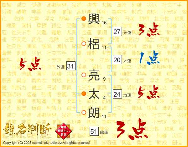 興(16画)梠(11画) 亮(9画)太(4画)朗(11画)