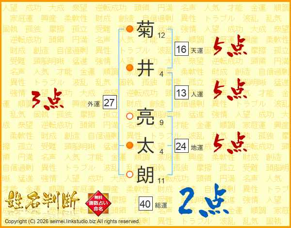 菊(12画)井(4画) 亮(9画)太(4画)朗(11画)