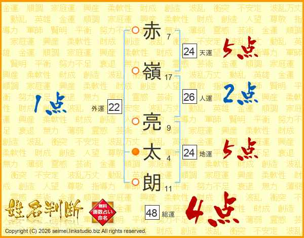 赤(7画)嶺(17画) 亮(9画)太(4画)朗(11画)