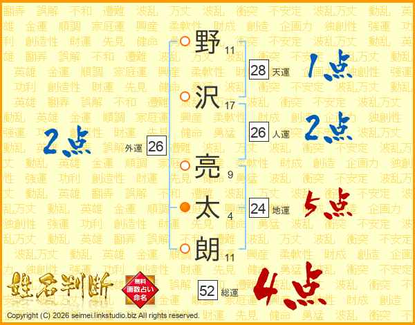 野(11画)沢(17画) 亮(9画)太(4画)朗(11画)