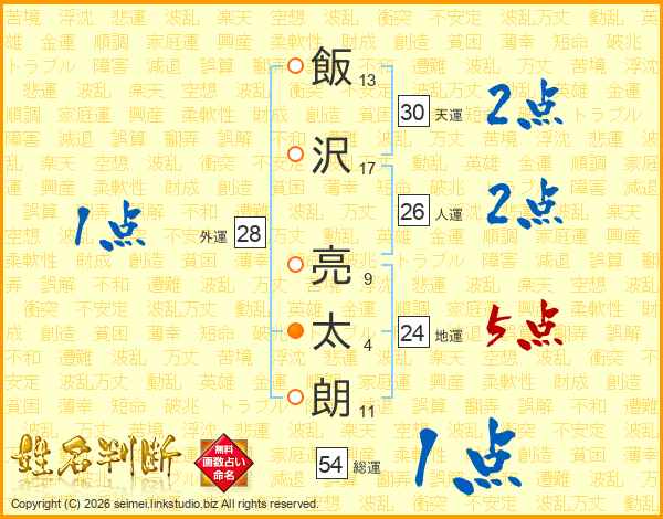 飯(13画)沢(17画) 亮(9画)太(4画)朗(11画)