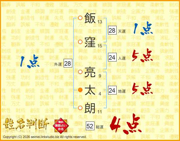 飯(13画)窪(15画) 亮(9画)太(4画)朗(11画)