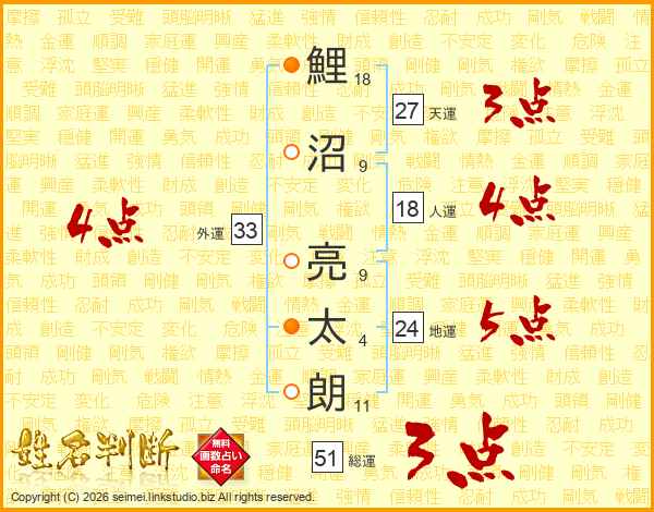 鯉(18画)沼(9画) 亮(9画)太(4画)朗(11画)