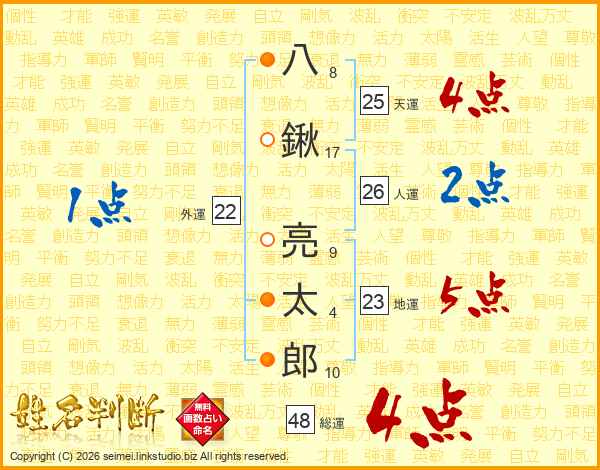 八(8画)鍬(17画) 亮(9画)太(4画)郎(10画)