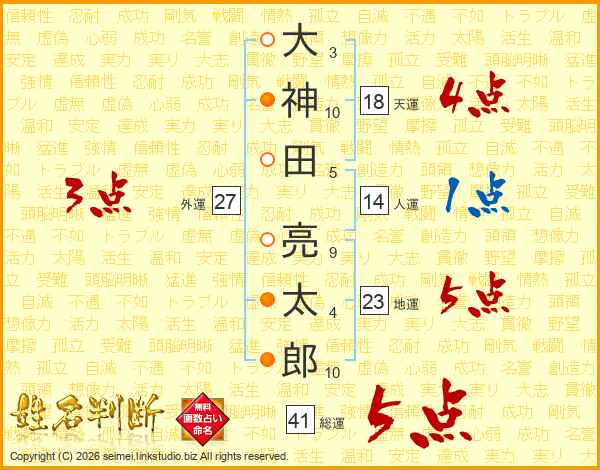 大神田亮太郎さんの総運は41画の5点!