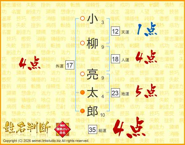 小(3画)柳(9画) 亮(9画)太(4画)郎(10画)