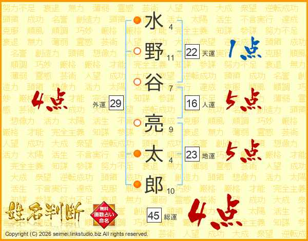 水(4画)野(11画)谷(7画) 亮(9画)太(4画)郎(10画)