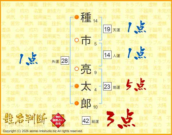 種(14画)市(5画) 亮(9画)太(4画)郎(10画)