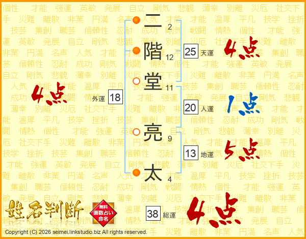 二(2画)階(12画)堂(11画) 亮(9画)太(4画)