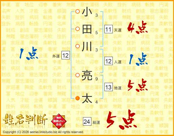 小(3画)田(5画)川(3画) 亮(9画)太(4画)