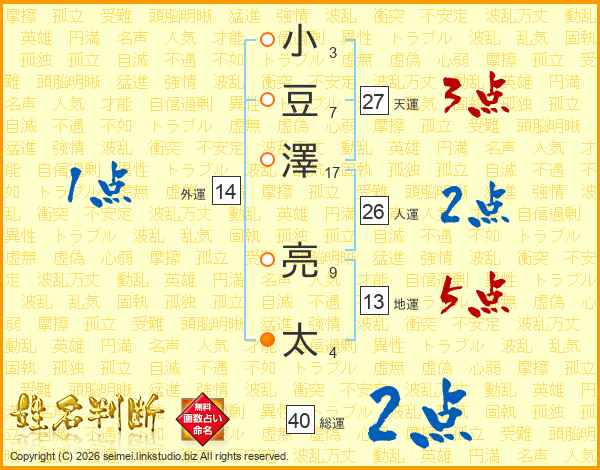 小(3画)豆(7画)澤(17画) 亮(9画)太(4画)