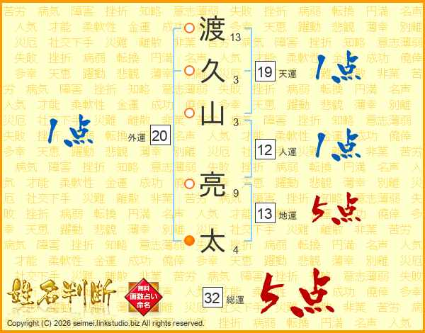 渡(13画)久(3画)山(3画) 亮(9画)太(4画)