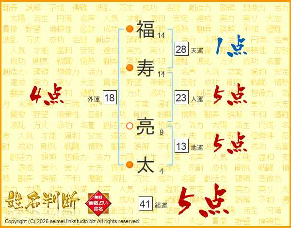 あなたの人生を表す1番重要な運勢です。生涯を通じて影響する総合運となり、主に50歳以降の晩年期に影響を及ぼします。苗字と名前の合計画数。