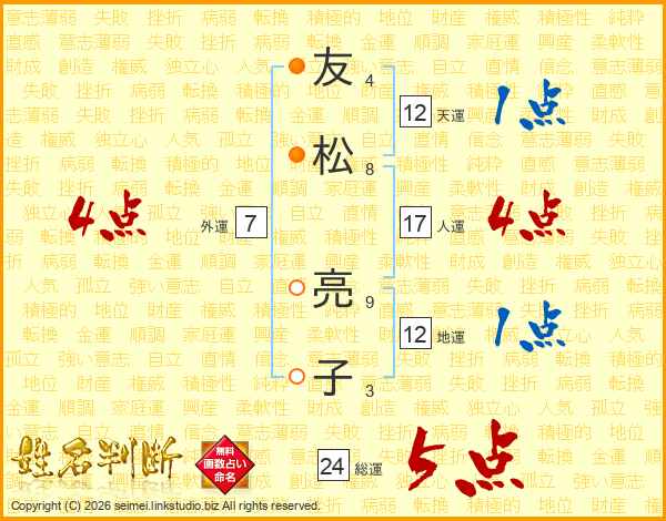 生活面を象徴する運勢です。外部から受ける影響力を表し、結婚運、家庭運や職場、環境への順応性を表します。総運から人運を引いた画数。姓や名が1文字の場合を除く。