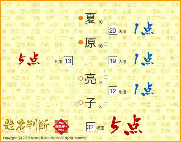 夏原亮子さんの総運は32画の5点!