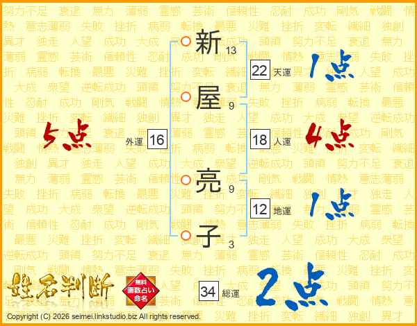 生活面を象徴する運勢です。外部から受ける影響力を表し、結婚運、家庭運や職場、環境への順応性を表します。総運から人運を引いた画数。姓や名が1文字の場合を除く。