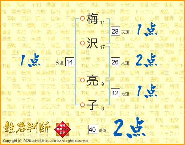 梅(11画)沢(17画) 亮(9画)子(3画)