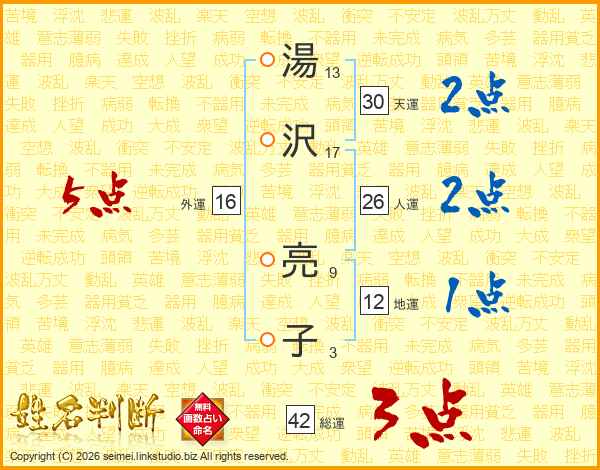 湯(13画)沢(17画) 亮(9画)子(3画)