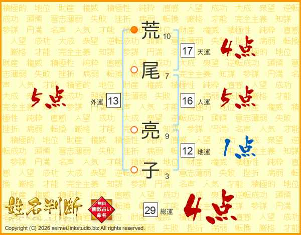 荒(10画)尾(7画) 亮(9画)子(3画)
