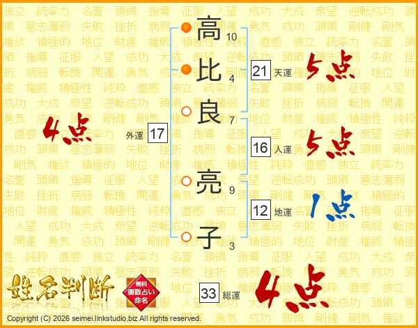 高(10画)比(4画)良(7画) 亮(9画)子(3画)