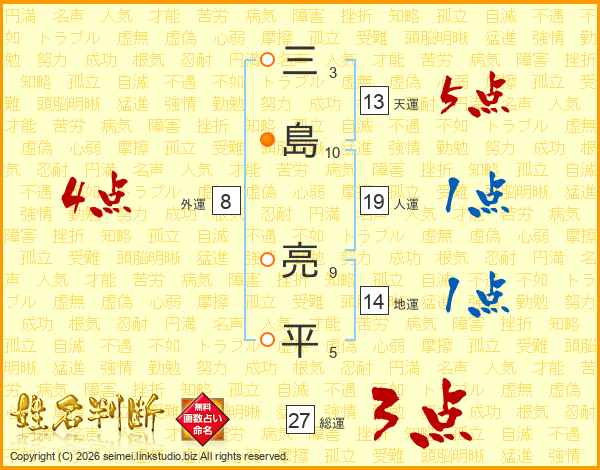 生活面を象徴する運勢です。外部から受ける影響力を表し、結婚運、家庭運や職場、環境への順応性を表します。総運から人運を引いた画数。姓や名が1文字の場合を除く。