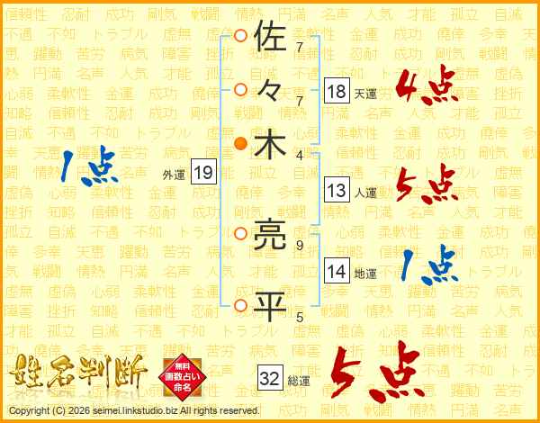 佐々木亮平さんの総運は32画の5点!