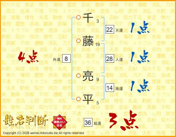 生活面を象徴する運勢です。外部から受ける影響力を表し、結婚運、家庭運や職場、環境への順応性を表します。総運から人運を引いた画数。姓や名が1文字の場合を除く。