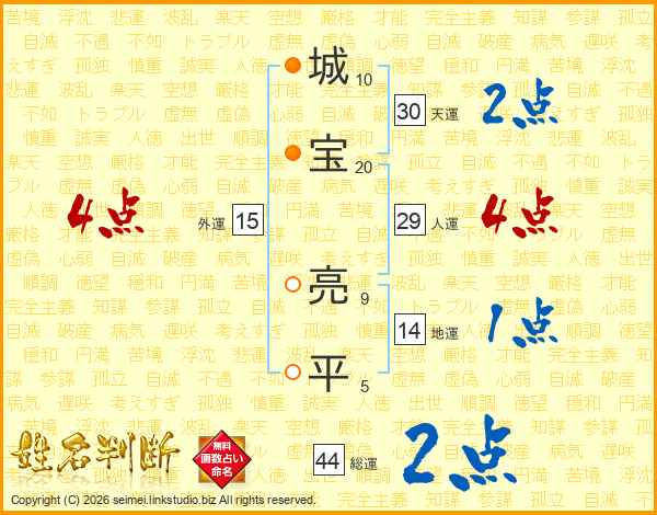 生活面を象徴する運勢です。外部から受ける影響力を表し、結婚運、家庭運や職場、環境への順応性を表します。総運から人運を引いた画数。姓や名が1文字の場合を除く。