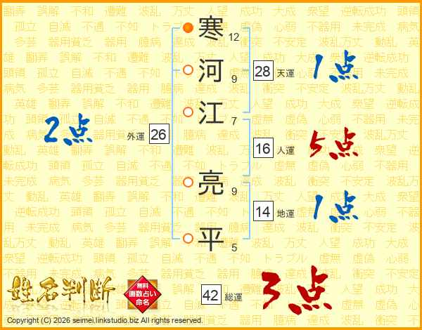 生活面を象徴する運勢です。外部から受ける影響力を表し、結婚運、家庭運や職場、環境への順応性を表します。総運から人運を引いた画数。姓や名が1文字の場合を除く。