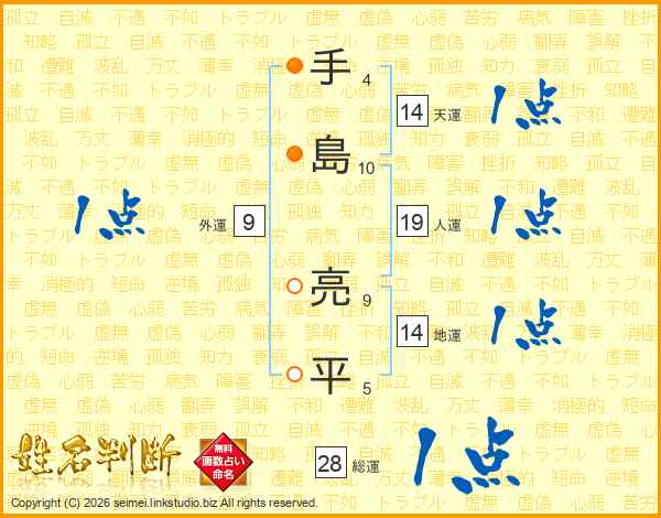 手(4画)島(10画) 亮(9画)平(5画)