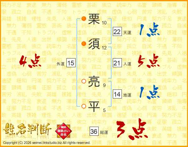 生活面を象徴する運勢です。外部から受ける影響力を表し、結婚運、家庭運や職場、環境への順応性を表します。総運から人運を引いた画数。姓や名が1文字の場合を除く。