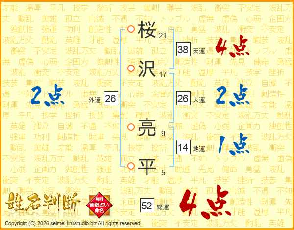 桜(21画)沢(17画) 亮(9画)平(5画)