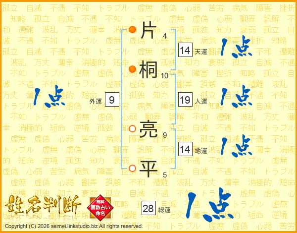 生活面を象徴する運勢です。外部から受ける影響力を表し、結婚運、家庭運や職場、環境への順応性を表します。総運から人運を引いた画数。姓や名が1文字の場合を除く。