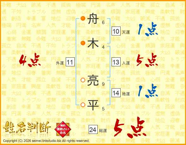 舟(6画)木(4画) 亮(9画)平(5画)