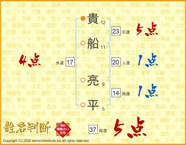 貴船亮平さんの総運は37画の5点!