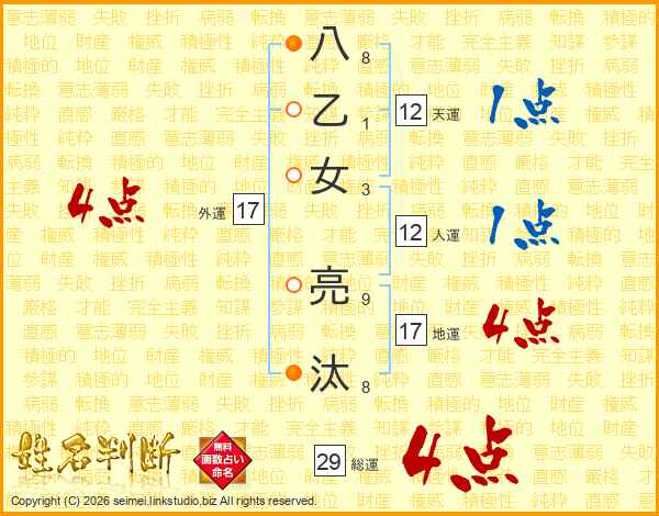 八(8画)乙(1画)女(3画) 亮(9画)汰(8画)