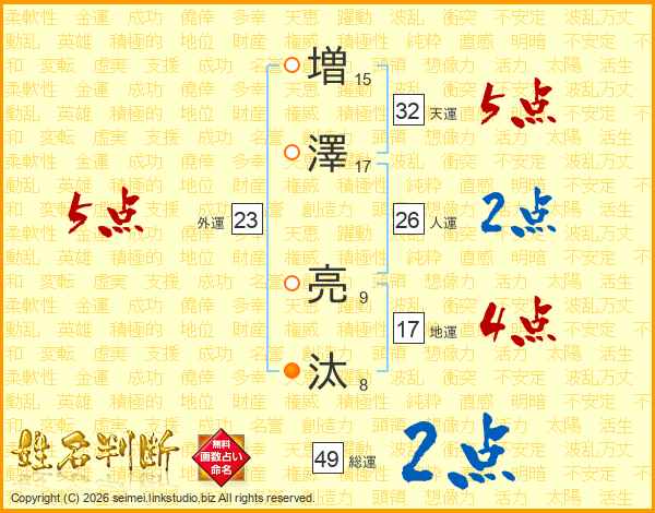 増(15画)澤(17画) 亮(9画)汰(8画)