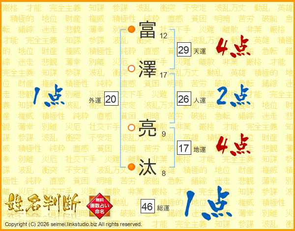 富(12画)澤(17画) 亮(9画)汰(8画)