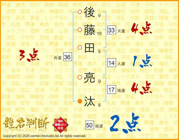 後(9画)藤(19画)田(5画) 亮(9画)汰(8画)