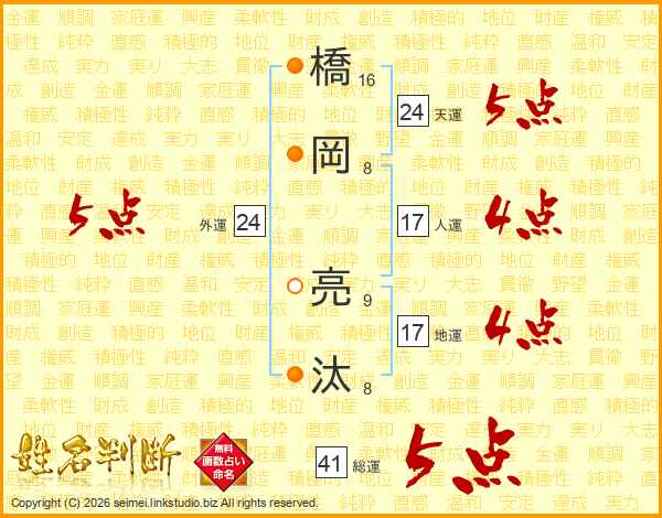 橋(16画)岡(8画) 亮(9画)汰(8画)